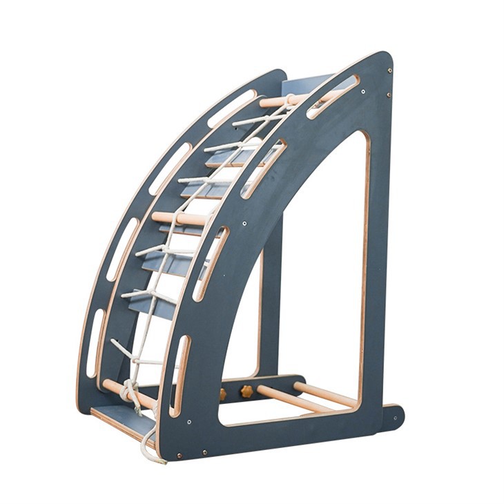 2. Характеристики на продукта: Стълбата за катерене е изработена от естествено дърво, а повърхността е боядисана с екологично чисти покрития на водна основа. Няма дразнеща миризма и отговаря на стандартите за употреба от деца. Сивият извит дизайн прави стълбата по-стабилна и лесна за изкачване, позволявайки на децата да изпитат щастлив процес на катерене.